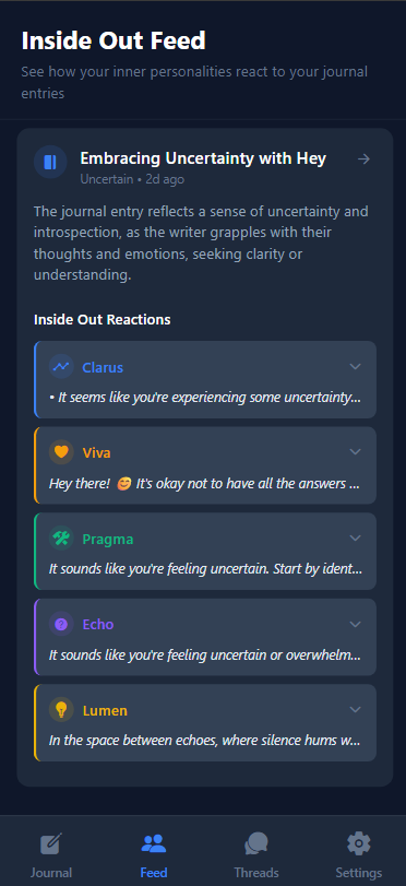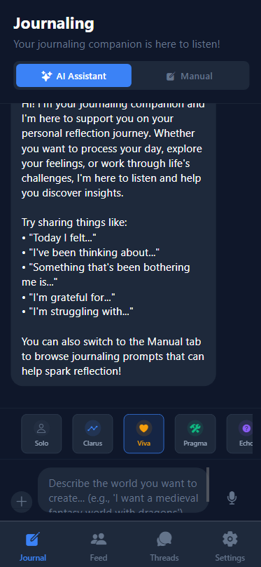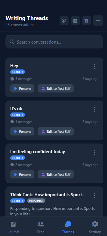 Keep track of your conversations, revisit past insights, and organize your personal growth journey with conversation threads that help you see your progress over time.